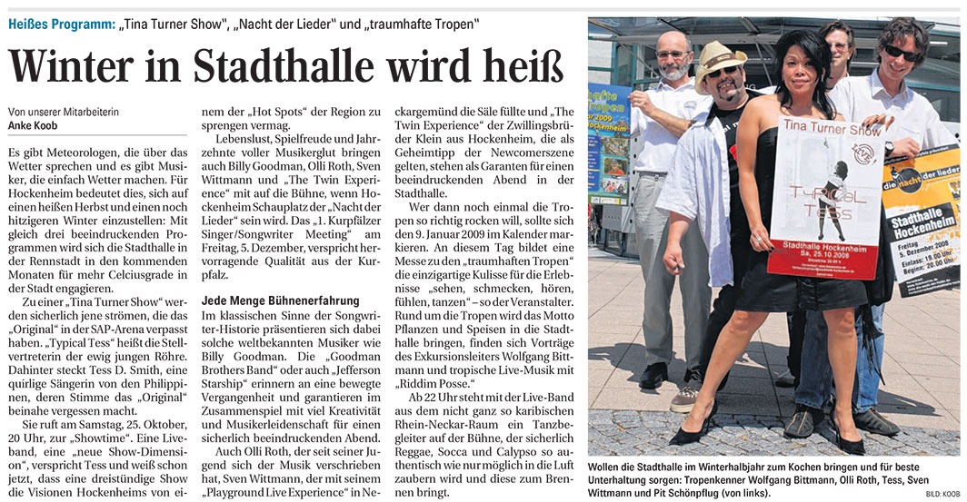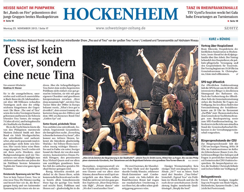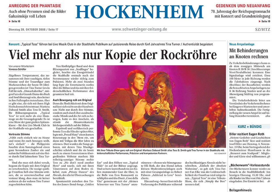 This wasn't a mere homage; Tess D. rocked her way from one highlight to the next with her six musicians, a backing vocalist, and four dancers, turning each of Turner's well-known top hits into a unique number.Unbridled temperament, which, together with her smoky, deep voice and dream figure, has become the trademark of the now 69-year-old: Tina Turner is a case in her own right. "Inimitable," fans of the grande dame of rock and soul may be convinced, that no one can follow in her footsteps. But there is one who dares to step into them, despite her high heels: Maritess Dabasol Smith, aka Tess D. Smith.